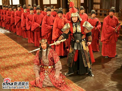 其二是虚构了一个唐军攻破“云中梁师都” 后的“绥州保卫战”“范兴率数千唐军坚守城池,眼看要攻破城池了,施罗叠却下令鸣金收兵。这引起了范兴的警觉。他召来熟知胡情的司仓参军赵恭存分析原因,认定颉利是要以绥州为饵,诱歼唐军主力。范兴派人突围向朝廷报信未果,危急关头,他决定献城示警,以绥州的牺牲保全唐军的主力不受损失。范兴故意让敌人攻入城中……为救民女采矶,范兴违心地向施罗叠下跪。……颉利入城,得知唐朝援军已经退走,自己的伏兵只和唐军前锋打了一小仗……他慨叹天不助己。”(引号内取自剧情介绍)