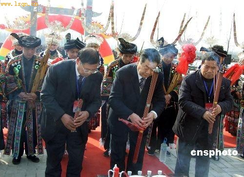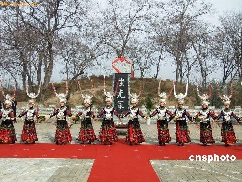 出席二00八中国(阳谷)第二界蚩尤文化研讨会的专家学者及苗族后裔,十一月二十七日在山东省阳谷县蚩尤冢前举行隆重的祭祀仪式。蚩尤与炎、黄两帝是中华民族的三大人文始祖。在上古时代,蚩尤作为九黎族部落的首领,生活在山东、河南、河北交界地带。逐鹿大战中,蚩尤战败,被黄帝杀死,身首异处,相传蚩尤的首级葬在阳谷。经过考证,阳谷作为古之“穷桑”,曾经是蚩尤九黎族活动的中心区域。 中新社发 杨东亮 摄