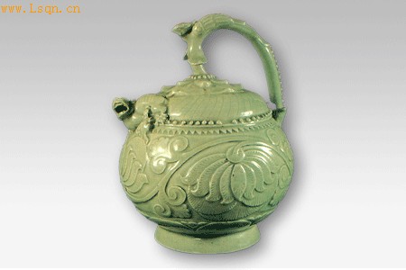 伏凤式提梁,以花蒂象征壶盖。盖、壶衔接处堆塑哺乳母子狮,母狮张口为流。球形壶腹刻饰缠枝牡丹。底部中心有梅花形注水孔,造型奇巧,是耀窑瓷器出类拔萃的珍品。