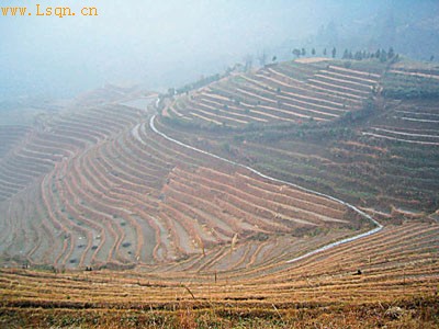 壮丽的梯田像美人一样被白蒙蒙的雾掩盖。