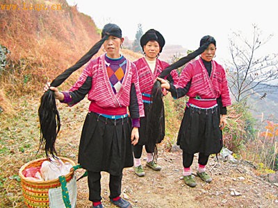 3位红衣瑶族妇女年近半百,她们手上的长发只于18岁时剪过一次。