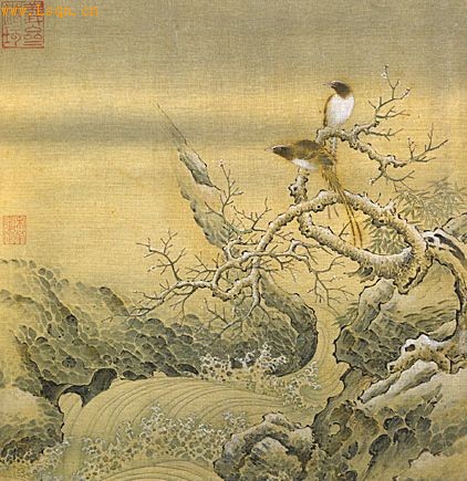 绢本,设色,纵27.5厘米,横26.8厘米。 本幅无款。钤“义斋精玩”、“宋荦审定”收藏印2方。 图绘山间冬季景色,天阴欲雪,霜柯临水,柯下溪涧奔流,水花飞溅,远处竹林葱茏。两只山鸟栖于枝头,眺望远方,将观赏者的目光引向画外,从而收到画尽而意无穷的艺术效果。 图中老柯、丛竹用笔刚劲,水花、鸟羽笔触轻柔,流水奔腾不息,山石巍峨不动,使画面形成刚柔相济、动静对比的艺术效果。清《石渠宝笈三编》著录。