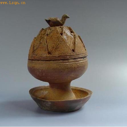 原始瓷器。盖作半球形,外壁用浅浮雕的装饰手法塑向上两层的三角形,三角形与三角形之间饰有圆形小镂孔,盖顶部塑有一立鸟,鸟展翅目视前方。炉身盆形,下有承柱和承盘。盖沿和炉身口沿处分别饰有一组弦纹。施青黄釉。