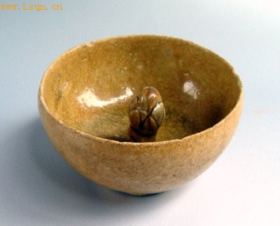 器钵形,口微敛,尖唇,弧腹,平底。器内底塑一荷苞状物,似含苞待放。釉黄绿色,釉晶亮,有开片。