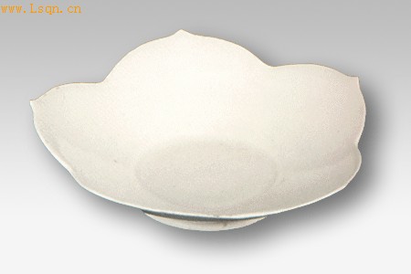 盘口为五尖瓣花形,胎白质细,釉色洁白莹润,造型精巧,足底刻有“官”字款。是唐代定窑产品。