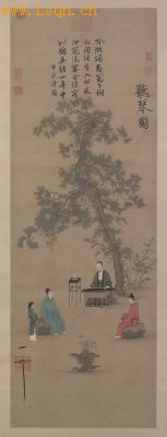 此幅描绘官僚贵族雅集听琴的场景。主人公道冠玄袍,居中端坐,凝神抚琴,前面坐墩上两位纱帽官服的朝士对坐聆听,左面绿袍者笼袖仰面,右面红袍者持扇低首,二人悠然入定,仿佛正被这鼓动的琴弦撩动着神思,完全陶醉在琴声之中。叉手侍立的蓝衫童子则瞪大眼睛,注视着拨弄琴弦的主人公。作者以琴声为主题,巧妙地用笔墨刻画出“此时无声胜有声”的音乐的意境。画面背景简洁,如盖的青松和摇曳的绿竹衬托出庭园高雅脱俗的环境,而几案上香烟袅袅的薰炉与玲珑石上栽植着异卉的古鼎与优雅琴声一道,营造出一种清幽的氛围。