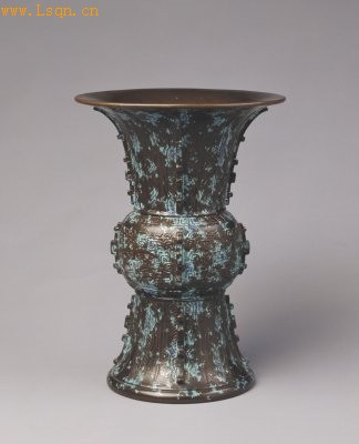 高28.4cm,口径14.6cm,足径14.6cm。 尊广口,鼓腹,圈足外撇。器身四面出戟,以青铜色为地,辅以绿松石釉、金银彩,间饰青铜锈色。外底刻阳文篆书“大清乾隆年制”三行六字款,外围金彩双方栏。 此件瓷尊无论造型还是颜色均刻意模仿青铜器,达到了使人仅凭肉眼无法辨别是瓷还是铜的地步,这种釉色是乾隆时期的新创釉色。