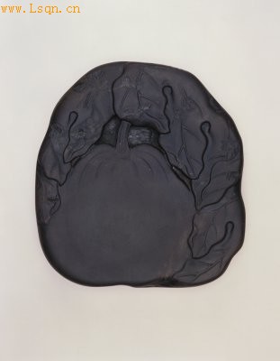 长20.4cm,宽18.9cm,厚3.1cm。 砚端石制,紫色,随材成形。砚堂琢为一瓜,肥大的叶子遮成砚边,叶上有斑斑蛀痕。瓜蒂处镂雕出砚池。砚背阴文篆书题“维彼瓜瓞,载咏绵绵,根深蒂固,于万斯年”,末署阴文楷书“万斯同铭”,并刻“季”“野”篆书印;左下方镌篆书“山阴吴氏珍玩”款,吴氏乃万斯同后又一鉴藏者。 此砚造型厚重,构思巧妙,颇具情趣。雕刻刀法简洁流畅,圆润无锋,于浑朴随意中表现出工匠纯熟的技艺,反映出明末清初的制砚风格。