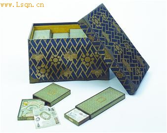 打开这件盖箱,里面却是别有洞天的另一番景观。箱内层层叠叠,按着次序依次置放抽拉式套匣45件,套匣边框为竹丝制,面裱织锦,内装玉器。套匣面嵌装铜鎏金把手,把手可启合,取用十分方便。套匣的面及屉两侧均嵌象牙,上绘有玉玩套装名,其作用是防止套匣与屉分开后张冠李戴,套内的屉为卧囊式,形状与所装玉器形状一致,而且加以彩绘,有山水画、花鸟画、诗词咏颂等,组成了一幅多姿多彩的图案。