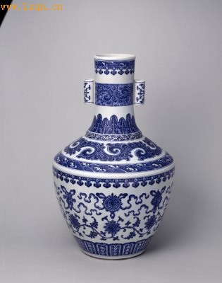 高60cm,口径13.5cm,足径18.9cm。 瓶直口,粗长颈,颈两侧饰贴对称贯耳,折肩,肩以下渐收,圈足。口沿绘海水和如意纹,双耳各绘莲花一朵,颈中部绘卷叶纹,颈下部绘蕉叶、卷草纹,肩部绘卷叶及海水纹,腹部主题图案绘如意纹及莲托八宝纹,近底处绘变形莲瓣纹。足内有青花篆书“大清乾隆年制”六字款。 此瓶造型高大古朴,青花发色艳丽,纹饰画法、图案布局均为典型的乾隆青花风格,是一件精致的宫廷陈设瓷器。
