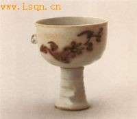 直口,深腹,腹部作一卷云状小系,高足作凸弦纹呈竹节状,杯底心与足上端以[子母榫]相接嵌合,可活动旋转。全器施青釉,杯外壁饰釉里红折枝菊纹两枝,运笔娴熟,线条流畅,十分精美。