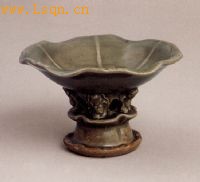高6.8厘米、口径10.9厘米、足径5.5厘米。 外翻口,下为高足,口部呈荷叶状,自然翩捲。通体施青黄色釉。高足上部有人物五名,面朝外,均作背托盘状,人物姿态誇张生动。下部收小,至足底部又扩大,呈外翻状。宋代耀州窑花口尊有较多烧造,但似此形制的作品极为少见,此器造型独特,具有很高的艺术观赏性。