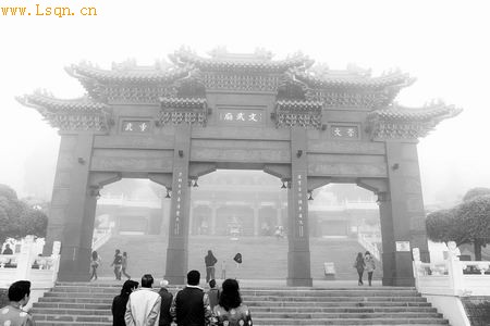 日月潭边的文武庙是由日月潭边神庙“益化堂”和“龙凤宫”合并而成,因供奉着孔子和关公、岳飞,被称为文武庙。图为文武庙牌坊。