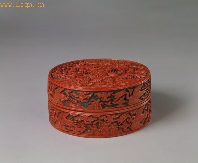 盒圆形,平盖,通体以绿漆为地刻锦,以红漆为面刻花。盖面雕一片海水浪花,中凸起3根石柱,松竹梅3株绕石而上,至顶端蟠成草书“福”、“禄”、“寿”3字。盖、器外壁雕凤、鹤飞舞于祥云之中、海水江崖之上。足内刻楷书填金“大明嘉靖年制”单行款。