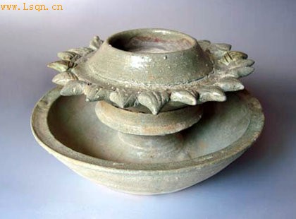 整器由钵形油盏及灯座组成。油盏为钵形,敛口,斜直壁,弧形腹,外壁中间围三角形莲瓣一周。灯座为一大钵形,敞口,平唇,弧腹,平底,中间立一灯柱,柱上端为盘口形,下端为圆形承柱。施青釉。