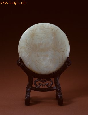 插屏青玉质,略带皮色,有绺。雕刻一老者展持手卷,笑容可掬。手卷上镌刻“一团和气”四字,文字戗金。另一面装饰类似的文字和图案,阴刻而非浮雕。