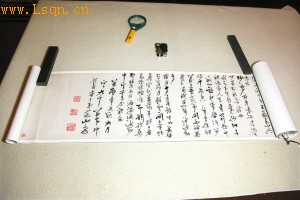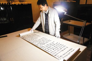 深圳博物馆工作人员仔细展开茅坤的《行草书诗卷》。