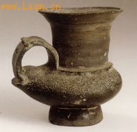 高10.1厘米、口径7.5厘米、底径5厘米。 灰色印纹硬陶。敞口,宽沿内折,高直领,扁圆腹、直圈足,唯腹的前部圆鼓,后部扁圆凸出上翘似鸭身形。腹后部的上翘处与颈肩相接处有一拱形鋬。形制与图一〇鸭形陶壶近似,唯颈部饰弦纹、腹部饰密集云雷纹装饰。其造形有明显的地方特征。