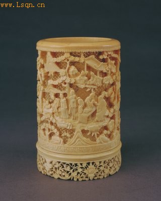 高16.3cm,口径10.5cm。 笔筒圆形。筒身以镂空古钱纹为地,凸雕山石、楼阁、人物。人物中有对弈饮酒者,有扶栏眺望者等等,应为桐荫消夏图。筒身下粘合牙座,座底周边镂空缠枝莲纹。 此笔筒雕工精细,为广东牙匠高手所为。