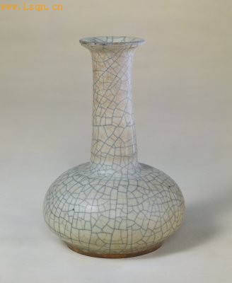 瓶撇口,口沿隐现酱紫色,细长颈,扁圆腹,圈足。颈及肩部凸起弦纹4道。器里外及底心满釉,釉面开“金丝铁线”片纹。底足露胎处呈酱褐色。