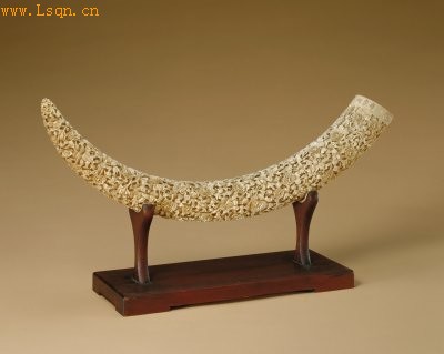 通长69.9cm,径8.3cm。 此为整根亚洲象牙雕刻。牙根处雕凸弦纹两道,弦纹间刻暗八仙纹及阳文“粤东同盛号制”楷书款,表明了制作的商号作坊。象牙的其他部位采用“百花不露地”的形式多层次雕刻牡丹、芍药、秋菊、玉兰等,寓意“玉堂富贵”。作品构图繁密,雕刻精细,富丽华贵,是房中陈设的佳品。