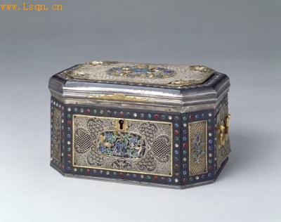 长16.5cm,宽12.3cm,高9cm。 盒为银胎,四方委角形,左右两侧设铜镀金提环。各面均以料石围边,内嵌开光,开光内饰银累丝花叶纹及烧蓝花卉、动物等纹饰。特别是盖面的制作更为精致:四角各錾刻松鼠,活泼可爱,中间嵌烧蓝五蝠捧寿纹。此盒的银累丝制作精良,技艺高超,细微处亦精益求精,可谓累丝工艺中的精品。 此盒作工精细,富丽堂皇,当为后妃盛首饰之用。