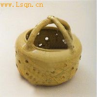 高15厘米、口径12厘米、底径12厘米。 圆口,斜肩,直腹,近底部内收,平底略内凹,口上安不对称的三叉形提梁。肩部画饰细密的弦纹,腹部刻划三十六个菱形大网格,每一格中镂一直径八毫米左右的圆孔。网格间加画四道弦纹。器表施青釉,不及底。这种器物在三国、西晋墓中时有出土,有的在器内装数只小碗,故又被称作“澄滤器”。