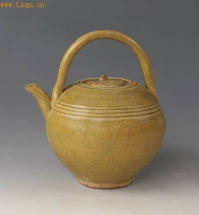 器型独特,造型像一只西瓜上塑一提梁。盖与口平行。肩侧饰管状短流。构思奇特。