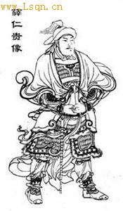薛仁贵,名礼,字仁贵,唐朝绛州龙门(今山西省河津市)人,隋炀帝大业十年(公元614年)生(一说大业九年生),唐高宗永淳二年(公元683年)卒,享年70岁。他一生屡立战功,他的征战事迹,《旧唐书》《新唐书》《资治通鉴》均有记载。薛仁贵一生分别在唐贞观十八年(公元644年)、唐显庆三年(公元658年)、唐乾封元年(公元666年)三次东征高丽,于唐龙朔元年(公元661年)、唐咸亨元年(公元670年)先后西征九姓回纥铁勒、吐蕃,“将军三箭定天山,壮土长歌入汉关”说的就是天山脚下征讨回纥。薛仁贵晚年还曾率军北击突厥,最终大获全胜。民间评书《薛仁贵征西》讲的是西凉八国东犯,唐王李世民御驾亲征,平西王薛仁贵为征西大元帅,薛家将浴血破西凉的故事。这些内容应该是薛仁贵屡次西征故事的杂糅,它只是民间的演绎,不是历史。在我少年的乡下,关于薛仁贵的故事有很多,不知什么原因,征东的口头评书没有,像“樊梨花征西”“薛仁贵征西”反而不少。