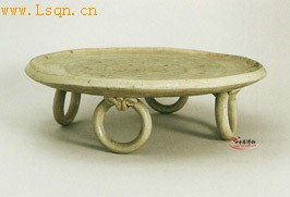 高11厘米、盘径36厘米。 此盘敛口,浅腹,下附四环形足,足与盘底用泥条捏成的云纹相连,既实用又富于装饰效果。通体施白釉,外部不过底。该盘造型奇特,尤其是四环形足,既显稳妥又给人以动感,实不多见。