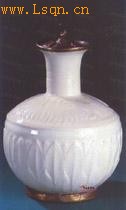 高19.8厘米,口径6厘米,底径8.9厘米。 这件北宋白釉瓶高19.8厘米,口径6厘米,底径8.9厘米。胎细白,釉透明,色洁白,积釉泛黄,足底露胎。采用刻花、划花技法,颈饰弦纹,周肩饰两组一菊一叶纹,腹部饰仰莲纹。刻工细腻,富于立体感。侈口长颈,广肩下折,圆腹,大圈足。造型秀雅。瓶口配置卷枝钮鎏金银盖,其中心饰覆叶纹,采用锤和凿的技法,其下并以鎏金银片包镶圈足。白瓷金装尤显得雍容华贵。1969年河北定州净众院塔基地宫出土。现藏定州市博物馆。