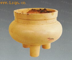 方唇,直口,束颈,鼓腹,下承三柱足,足底有小圆出气孔。颈部模印长脚卍字纹。胎灰白。器重。釉色白中泛黄,开浅细纹片。釉层肥润。