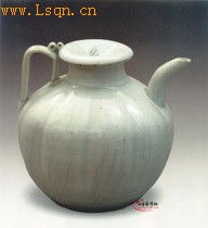 翻唇口,短颈,瓜棱球形腹,肩一侧置流嘴,对称的另一侧肩腹部置把手,平底,壶盖为荷花钮,影菏釉,为景德镇窑产品。