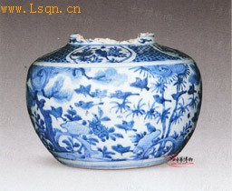 这件青花树鸟纹罐高18.5厘米,口径13厘米,足径18厘米,最大腹径25厘米。此罐的口、颈部残损较甚。其总体造型扁圆,唇口,丰肩,砂底浅圈足。腹部接胎痕明显可见,胎釉结合处火石红呈橘黄色,釉面青亮。青花料为典型的石子青发色,微泛黑灰。肩、腹、颈三层纹饰;颈部以变形卷草纹装饰。肩部四开光辅以锦地纹陪衬,开光内各小鸟一只站立枝头;罐腹两松两竹对画,松竹之间40余只小鸟神态各别:或振翅欲飞,或两首相望窃窃私语,或呆立枝头若有所思,或减速欲落,或急飞穿林而过,或回头张望——好一幅鸟王国的热闹场面,把个万历朝绘画繁密的时代风格表现得淋漓尽致。