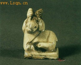 高3.2厘米。 该件瓷羊跪卧于板座上,双眼圆睁,平视前方,双角直立,颈部毛髹分梳两侧,嘴角微张,短尾下垂。通体施白釉,釉质透明光亮,白色胎,额头施褐彩加以点缀,神态自然,形象逼真,讨人喜欢。整个造型采用捏塑、刻划相结合的技法。系唐城遗址出土不多见的一件玩赏珍品。