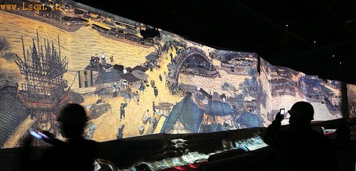 长百米的多媒体《清明上河图》。这幅高科技长卷上,宋代的市井人物栩栩如生,是中国馆一大亮点。(新民晚报 陈正宝)