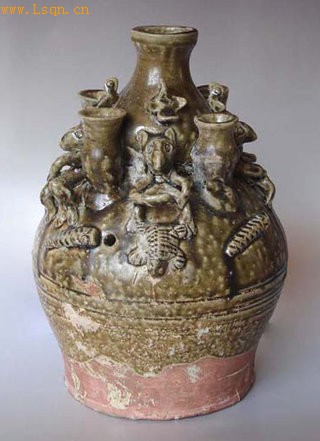 罐体呈上下两部分,上部为中间洗式罐口,口的四角对下各贴一小瓶,瓶与罐身不相通,长颈,罐体下部丰满,饰弦纹。肩部贴塑立熊三只,另贴塑有乌龟、蝌蚪。施青褐色釉,下腹部无釉。
