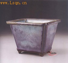 高14.7厘米、长22厘米。 花盆长方形,折沿口,敛腹,下承四乳足,通体施釉。釉饰于天蓝色中渲染紫红色调,互相掩映,妙不可言。 此器属宋代官钧窑花盆中的一种。官钧窑是钧窑瓷器中为宫廷烧制瓷器的瓷窑,因北宋“花石纲”的特定因素而烧制陈设器。此为宋代官钧窑花盆中独具特色的器皿,它一改圆形花盆的形制而成长方形花盆,显得格外新颖、别致。