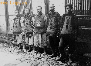 此照片摄于1909年,照片中几位胸前的字“灌县正堂缉勇”,是职业身份标注。正堂,即政府治事的大堂,明清又是知县、知府的代称。缉勇,即担负缉拿案犯等治安事宜的男丁,相类于今天的“巡警”。灌县正堂缉勇,就是灌县衙门雇佣的“巡警”。 (龚探)
