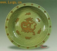 口径43.2厘米。 鋬沿,弧壁,浅圈足内敛,形制硕大,釉色青绿喜人,以露胎贴花技法在口沿和内底分别装饰朵花和云龙戏珠纹,内壁则在釉下满刻波涛纹。 “露胎贴花”是以模印技法用瓷泥制成浮雕状的图案花纹,贴在已经施釉的坯体上,花纹部分露胎不上釉,经烧成後花纹因氧化呈红褐色,具有极为独特的装饰风格,是元代龙泉窑新创烧的一个品种。这件大盘制作规整精美,龙纹生动形象,是元代龙泉窑的一件佳作。