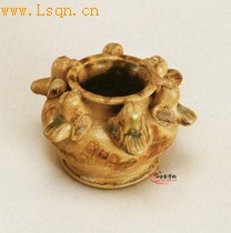 高6.5厘米、口径4.8厘米、底径5.2厘米。 口沿微卷,短颈,器腹扁圆,假圈足,平底。肩部饰捏塑小鸟六只,呈蹲伏状,等距排列一周,口衔盂沿似争饮水态。胎质灰白,器身褐、绿彩点缀,外罩一层透明青釉,釉色有细裂纹彩釉清新淡雅。 该盂造型精巧,生动活泼,富有动感。长沙窑瓷器造型之多,在唐代诸窑中绝无仅有,此盂的造型,当属稀罕。
