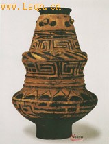 高27.5厘米。 泥质红陶。小口、沿外卷、厚圆唇,长颈斜外侈,上小下大双扁圆腹,束腰,假圈足、平底。除颈有三个对称乳钉纹外,通体用黑、红两色矿物原料,彩绘出横条纹、斜线纹、云雷纹。三角纹等图案装饰。造型别致,色彩鲜艳,纹样醒日而华丽,极富地方特色。