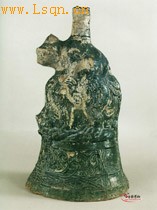 泥质红陶,模制。此座下大上小。下部中室。上部堆塑两个狮子状的怪兽,上下重叠,头向外伸出,作张口咆哮状。顶部有一圆孔,应是供插铜质钱树枝干用。下部四周浮塑着乐舞人像。