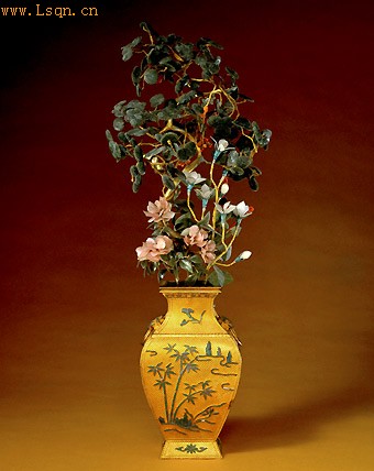 双耳活环金瓶松树花卉瓶景,清乾隆,造办处造,通高64cm,瓶高22.5cm,瓶口径8.8-6.2cm,腹径14.4-10.8cm。清宫旧藏。