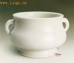 高4厘米、口径4.5厘米。 炉口外敞,鼓腹,圈足外撇,颈肩部饰双螭龙为耳。通体施透明釉,釉肥厚而滋润。胎体洁白坚致细腻,微泛红色,是明代德化窑典型的糯米胎。炉朴素无饰,纯粹以优美的造型取胜。炉的腹部较为突出,但在颈肩部饰有两个螭龙耳,使得炉的造型,在视觉上得到了平衡,简洁明快中又不失轻灵之气。