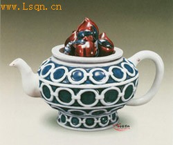 高12.8厘米、口径8.4厘米、足径7.6厘米。 壶圆腹,弯流,椭圆形柄,圈足。青色地上饰有四圈凸起相联的白色圆环,青地白环,对比强烈,且环环相结,连绵不绝,寓意长寿。盖上部是由四个雕塑的釉里红桃组成,桃枝、桃叶均以青花着色,青枝红桃鲜艳无比。青花、釉里红都需经高温烧成,此是青花、釉里红品种中的典型作品。