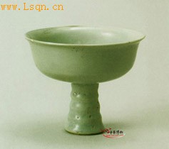 高9.5厘米、口径11.2厘米、底径3.9厘米。 敞口,竹节状喇叭形高圈足,内壁中心印一几何形花卉,周围印两条追逐中的云龙,龙身细长,曲度较大,张口五爪,胎较薄,釉厚而柔润,足与杯底用瓷胎水粘接,印花五爪行龙夹云纹是元代器型的特点,仍属枢府类型。