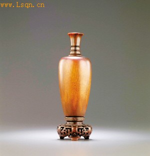 莱菔尊又名“三弦瓶”。“莱菔”是“萝卜”的别称。这种瓶式的瓷器在清代十分流行,用在犀角雕中很少见。此拍品线条修长,丰肩敛腹,犀角料呈润泽的蜜色,间以茶色条纹,观之含蓄悦目。此尊撇口,长颈,丰肩,敛腹,圈足。颈下部凸起弦纹三道,通体光素无纹饰,足内刻“康熙御制”四字楷书款。整体色泽莹润,造型古朴简雅。依其大小和纹理来看,此尊应是用一根巨大的印度犀角雕琢而成,制作时耗料甚多。工匠技术高超,掏膛规整,和康熙时宫廷专用名瓷“豇豆红莱菔”如出一辙,为犀角器中罕有的珍品。此尊应为康熙皇帝御用的丞水器。据说古代最名贵的京墨含有犀角的成分,书写后散发芳香,更有防虫的功用。用犀角器盛水,亦有同样的效果。
