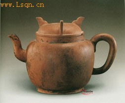 高11厘米、口径7.5厘米、腰径11厘米。 壶通体粟红,布满犁皮状小颗粒,直口,丰肩,鼓腹,平底圈足,圈足至口沿等大,外壁均垂直,底内弧,曲流,流上部出棱,流中一圆孔,柄体圆,盖顶倒立三鼎足,足体方扁,外向作两个圆弧,器底阴刻“时大彬制”四丰,单刀竖刻,楷书。时大彬为时代最著名的紫砂陶工匠,该壶为其早期作品,壶盖内沿有小磨损,证明为墓主生前使用过一段时期,为目前出土的、绝对年代最早的时大彬作品。