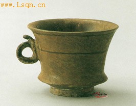 敞口,斜腹壁,胫部外凸,小圆饼足。腹部一侧塑一“6”形执柄,形制典雅别致。此器出土于洪州窑址,是洪州窑仿金银器之精品。
